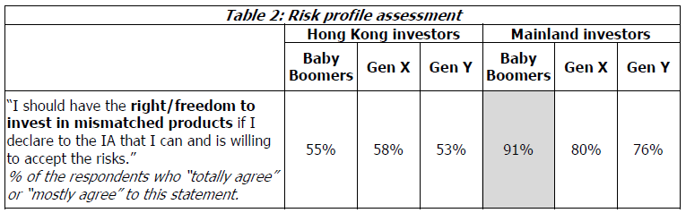 內地投資者更願意投資於錯配產品,82%表示他們應該有這樣的權利。嬰兒潮一代特別擁有這樣的看法。(表2)
