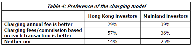 更多香港基金投资者更喜欢基于佣金的模式,而以收费为基础的模式,57%表示这样。内地投资者的意见不一,选择收费模式的比例略高。 (表4)